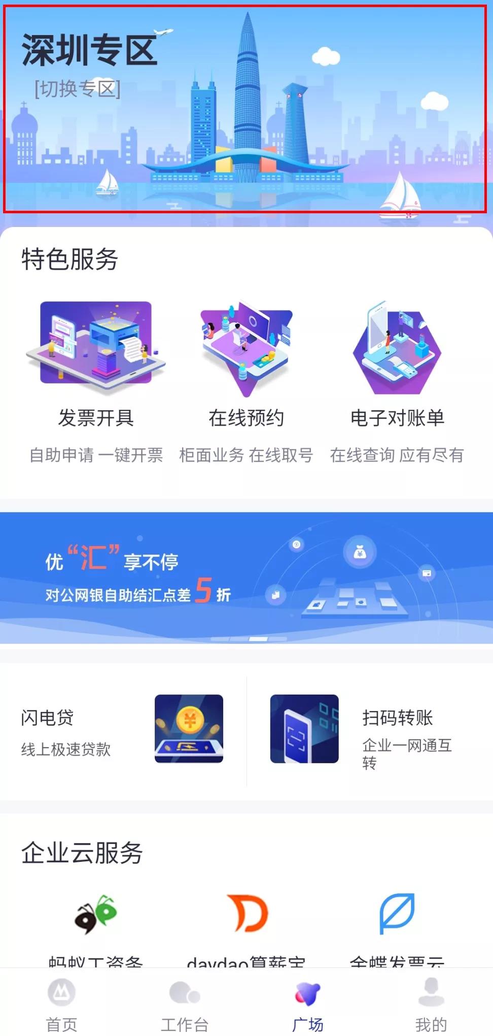 打開招商銀行企業(yè)App,點擊“廣場”板塊,找到深圳專區(qū)。