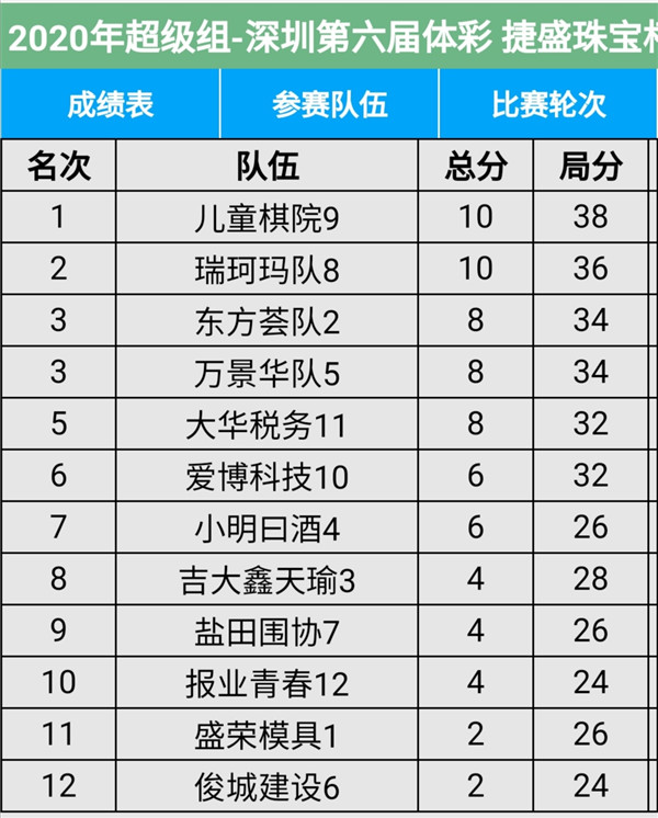 見圳客戶端?深圳新聞網(wǎng)2020年11月8日訊(記者周錦春)第六屆“體彩?捷盛珠寶杯”深圳市圍棋聯(lián)賽繼續(xù)在羅湖區(qū)藝嘉大酒店展開,今天是第二場(chǎng),有第4輪至第6輪的比賽。目前,超級(jí)組中,兒童棋院隊(duì)、瑞珂瑪隊(duì)領(lǐng)先;甲級(jí)組中,大眾建設(shè)、深圳大學(xué)領(lǐng)先。具體賽程結(jié)果請(qǐng)看本文附后表格。