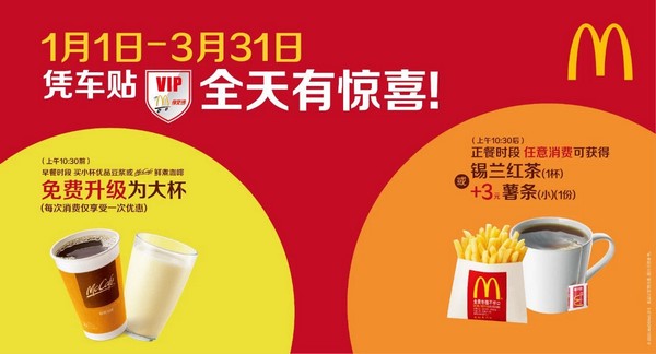 開車取餐少接觸,麥當(dāng)勞“得來速”餐廳讓駕車的顧客購餐更方便、安全且快速。駕車者不用下車,在餐廳車道的窗口即可完成點(diǎn)餐、付款和取餐?,F(xiàn)在免費(fèi)領(lǐng)取 VIP車貼享福利,3月31日前,早餐時(shí)段購買小杯優(yōu)品豆?jié){或鮮煮咖啡可免費(fèi)升杯;正餐時(shí)段任意消費(fèi)即贈(zèng)錫蘭紅茶,或者加3元換一份小薯?xiàng)l。(常軍平)