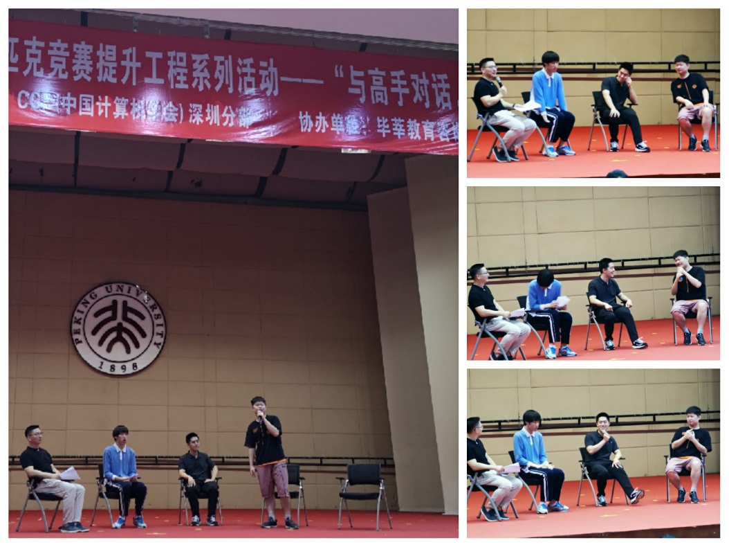 本次活動(dòng)除了邀請(qǐng)周楷文同學(xué)親臨現(xiàn)場(chǎng)之外,還邀請(qǐng)了雅禮中學(xué)正高級(jí)教師,為雅禮貢獻(xiàn)了9塊IOI金牌的朱全民老師;北京大學(xué)深圳研究生院計(jì)算機(jī)專(zhuān)業(yè)雷凱副教授;雅禮中學(xué)畢業(yè),通過(guò)信息學(xué)競(jìng)賽保送到北京大學(xué)信息科學(xué)與技術(shù)學(xué)院計(jì)算機(jī)專(zhuān)業(yè)就讀本科以及研究生的章嘉晨同學(xué),國(guó)際大學(xué)生信息學(xué)競(jìng)賽(ICPC)區(qū)域賽金獎(jiǎng)、報(bào)送北京大學(xué)深圳研究生院就讀計(jì)算機(jī)專(zhuān)業(yè)的陳銳彪同學(xué)。