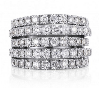 | De Beers戴比爾斯Classic五行戒指 18K白金傳遞著經(jīng)典而現(xiàn)代的時(shí)尚宣言??傊?.75克拉。密鑲。戒指寬度:13 mm。 |