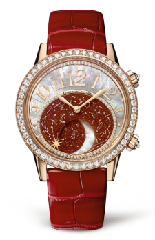 積家 Rendez-Vous Moon約會系列月相腕表玫瑰金款呈現奔放熱情的迷人魅力,精致閃耀的表殼宛如一曲獻給璀璨夜空的頌歌。腕表以無限詩意展現大工坊制表大師的精湛技藝,浩瀚縹緲的星空圖案鐫刻于腕表之上,令人沉醉。熱情的火光色彩“鋪滿”玫瑰金表殼之上,紫紅色砂金石表盤呈現北半球的浩渺蒼穹。表盤和表殼均以鉆石鑲嵌,流光溢彩。珍珠母貝打造的一彎明月在浩瀚星空中緩緩移動,與顯示數字時標的表盤采用相同工藝打造,散發(fā)皎潔光彩。一枚星形指針,以最富詩意的方式提示著佩戴者下一個約會的時間。