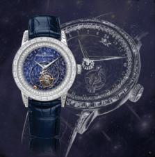 積家 Master Grande Tradition Tourbillon Céleste超卓傳統(tǒng)陀飛輪大師系列星空腕表以讓人目眩神迷的方式詮釋時間。為了充分展現腕表的天文特性,軌道式飛行陀飛輪顯示的為恒星時間而非太陽時間,比太陽時間縮短近四分鐘。在這款腕表的表盤外沿,附帶太陽標志的指針以24小時為一周在表盤上轉動。表圈顯示了24小時刻度、黃道十二宮星座與月份。軌道式飛行陀飛輪與星辰和星座同步運轉,和表盤共演一段恒星之舞。