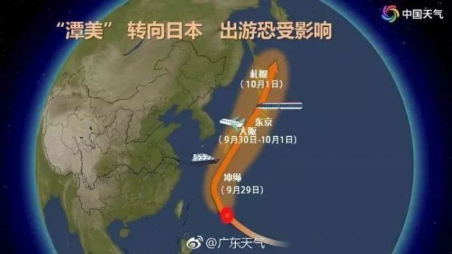 另據(jù) @廣州天氣,"潭美"28-29日最接近臺灣,隨后掉頭往東北方向移動,國慶期間前往臺灣的朋友不用擔(dān)心。