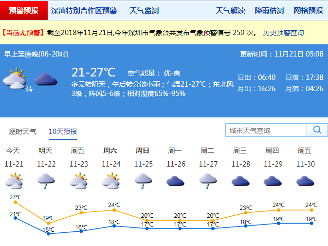 市氣象局預(yù)計,20日17-20時,深圳市以多云天氣為主;氣溫在22-25℃;相對濕度65%-85%;偏北風(fēng)3-4級,陣風(fēng)5-6級;全市能見度大部分地區(qū)在10公里以上。傍晚天氣舒適,適合戶外運(yùn)動。21日夜間至22日冷空氣影響,有小雨,北風(fēng)加大,沿海和高地最大陣風(fēng)7-8級,22日最低氣溫會降至15℃左右;23-24日晴天間多云,氣溫回升;25-26日,陰天有陣雨。