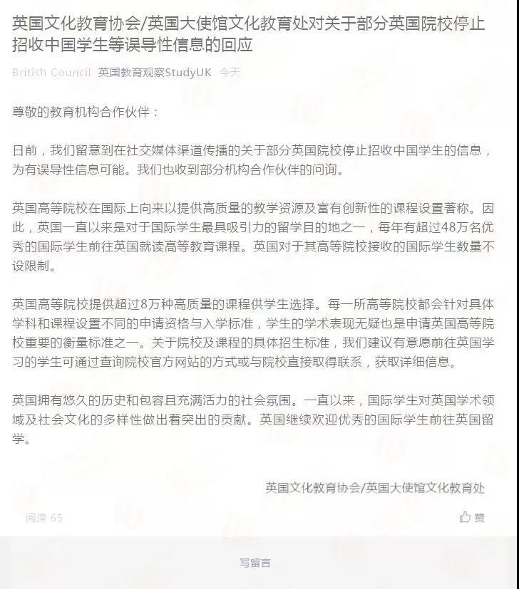 記者發(fā)現(xiàn),英國文化教育協(xié)會/英國大使館文化教育處對關(guān)于部分英國院校停止招收中國學(xué)生這一信息已做出官方回應(yīng):他們留意到在社交媒體渠道傳播的關(guān)于部分英國院校停止招收中國學(xué)生的信息,為有誤導(dǎo)性信息可能。
