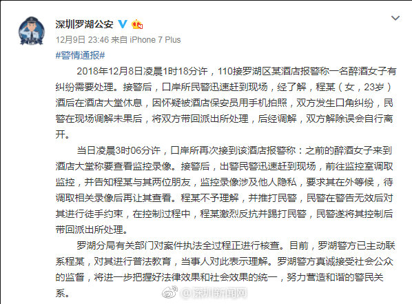 原因是12月9日,一微博名為“微信初秋”的網(wǎng)友發(fā)文稱,因執(zhí)意查看糾紛案件監(jiān)控視頻,遭到深圳市羅湖公安分局羅湖口岸派出所民警暴力執(zhí)法。