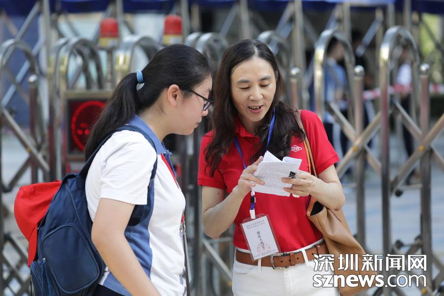 深圳實(shí)驗(yàn)中學(xué)老師等待在考點(diǎn)外,為學(xué)生發(fā)放準(zhǔn)考證