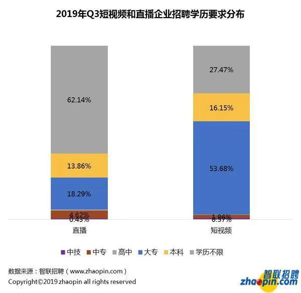 短視頻相關崗位對內(nèi)容創(chuàng)意、視頻編輯等知識和技能的要求更高,因此對人才素質(zhì)要求也更高。2019年三季度,短視頻招聘職位中,53.68%的職位要求大專學歷,16.15%的職位要求本科學歷,直播領域的這兩個比例分別為18.29%和13.86%,卻有62.14%的崗位不限學歷。