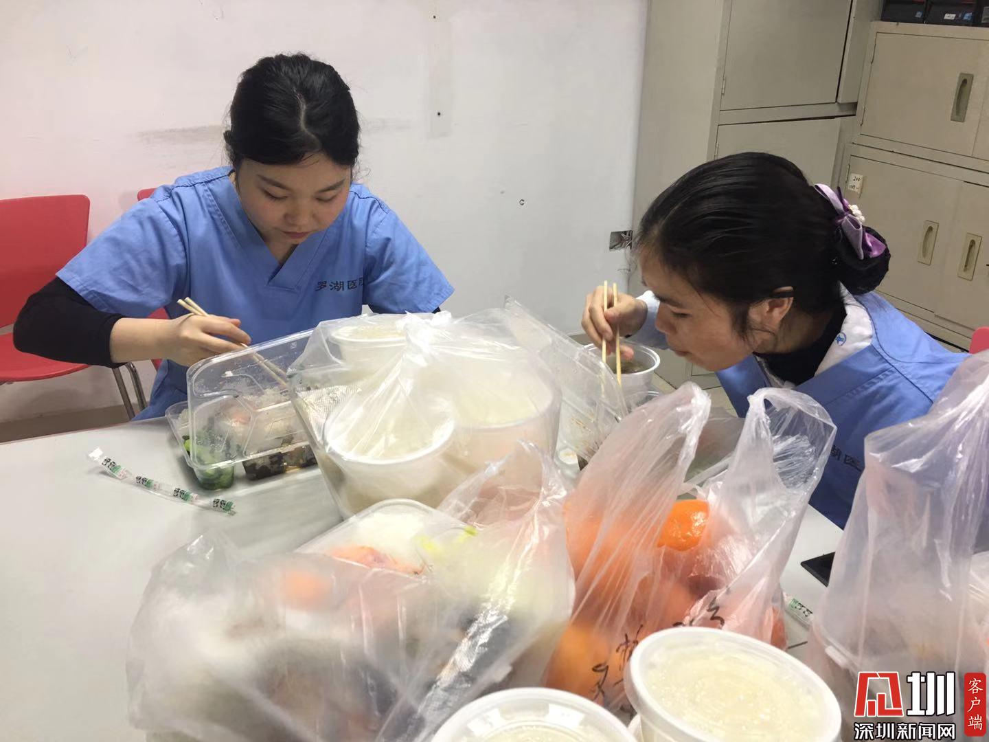 2020年2月6日,正在用午餐的羅湖區(qū)人民醫(yī)院發(fā)熱門診醫(yī)護人員。因為新型冠狀病毒感染的肺炎疫情形勢嚴(yán)峻,醫(yī)護人員由以往的到食堂吃飯,改為現(xiàn)在將飯統(tǒng)一領(lǐng)回到辦公區(qū),大家到辦公室分餐吃。為避免集中用餐,改為分批輪流吃飯。(見圳客戶端、深圳新聞網(wǎng)記者彭桂紅)