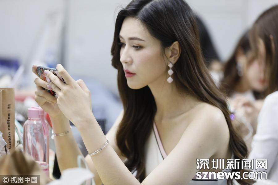 2018年11月16日,廣州,第十六屆中國(guó)(廣州)國(guó)際汽車展覽會(huì)媒體日。模特候場(chǎng)表演間隙,陳宏偉玩手機(jī)游戲