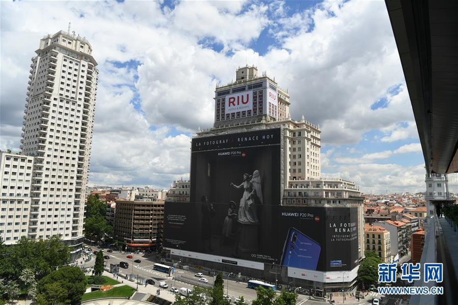 2018年6月12日,位于馬德里市中心的西班牙大廈掛出華為P20 Pro手機超大幅廣告。新華社記者郭求達攝