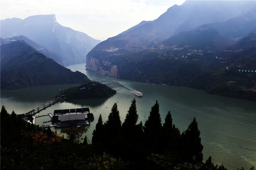 2019年11月3日,位于重慶市奉節(jié)縣長江三峽入口處、夔門正前方的白帝城再現“孤島景觀”。這座曾經雄踞山之峰巒的三國歷史文化名城隨著三峽工程175米實驗性蓄水完成,僅憑一處風雨廊橋可以通過。圖為2019年11月3日,重慶,四面環(huán)水的“白帝城孤島”風貌,各種豪華游輪陸續(xù)駛往寶塔坪旅游碼頭,供游客們登島參觀。饒國君/視覺中國