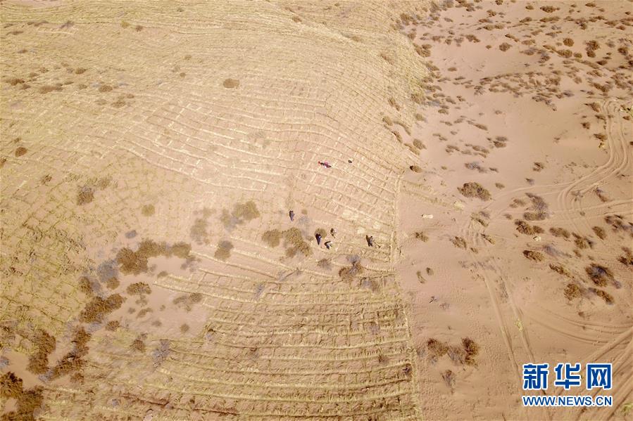 3月5日,在古浪縣北部沙區(qū)旱麻崗治沙點(diǎn),群眾扎草方格壓沙(無(wú)人機(jī)照片)。初春時(shí)節(jié),在騰格里沙漠南緣的甘肅省武威市古浪縣,當(dāng)?shù)馗刹柯毠ぜ鞍瞬缴沉謭?chǎng)治沙人共同在縣城北部沙區(qū)旱麻崗治沙點(diǎn)開展春季治沙勞動(dòng)。新華社記者 范培珅 攝