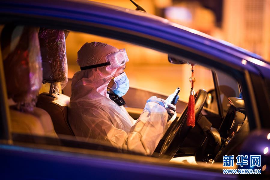 2月29日凌晨,在湖北武漢,志愿者王震在車內(nèi)查看導(dǎo)航。 新華社記者肖藝九攝