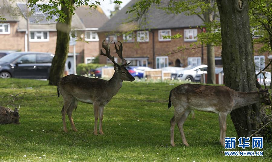 4月8日,在英國倫敦東部一個(gè)居民區(qū),附近公園里的鹿在草坪上駐足。隨著新冠疫情在英國的擴(kuò)散,政府要求人們減少不必要的外出。倫敦東部一個(gè)居民區(qū)附近公園里原來散養(yǎng)的鹿紛紛從公園走出來,或吃草或接受附近居民的喂食,成為特殊時(shí)期居民區(qū)里的新“客人”。新華社記者韓巖攝