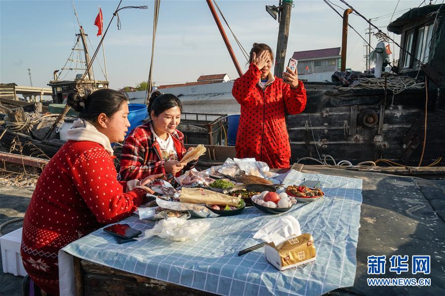 4月22日,馬花雨(下右)、徐紅紅(上)、陸倩(下左)在漁船上拍攝推銷海產品的短視頻。近年來,江蘇省連云港市贛榆區(qū)海頭鎮(zhèn)越來越多的居民開始直播銷售海產品,當地漁船、碼頭和市場上活躍著一批網絡直播好手。目前,全鎮(zhèn)有3000多戶商家從事海產品直播銷售業(yè)務,形成了集捕撈、加工、包裝、銷售和物流于一體的電商產業(yè)鏈。新華社記者楊磊攝