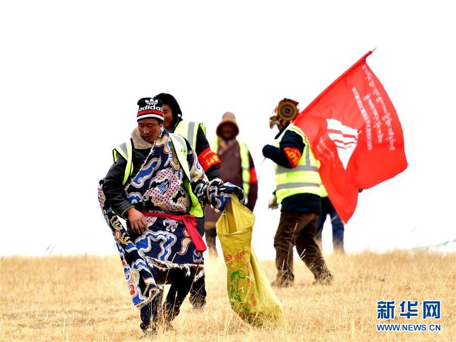 在三江源國家公園黃河源園區(qū),扎陵湖鄉(xiāng)生態(tài)保護(hù)站勒那村生態(tài)管護(hù)隊第七組的隊員在撿拾垃圾(2018年12月2日攝)。