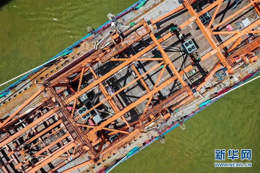 8月9日拍攝的廣州南沙港鐵路跨西江特大斜拉橋最后一塊鋼箱梁吊裝施工現(xiàn)場(無人機照片)。當日,中鐵十一局承建的粵港澳大灣區(qū)基礎(chǔ)設(shè)施“硬聯(lián)通”重點工程——廣州南沙港鐵路跨西江特大斜拉橋完成最后一塊鋼箱梁吊裝作業(yè),大橋即將合龍。該橋位于廣東佛山市和江門市交界處,全長1117.5米。新華社記者劉大偉攝。