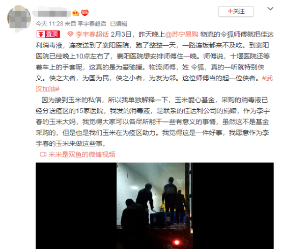 這批物資中,安排消毒液的網(wǎng)友是李宇春的粉絲,他們當(dāng)晚就將令狐師傅日夜兼程的故事發(fā)布到了社交平臺(tái)。