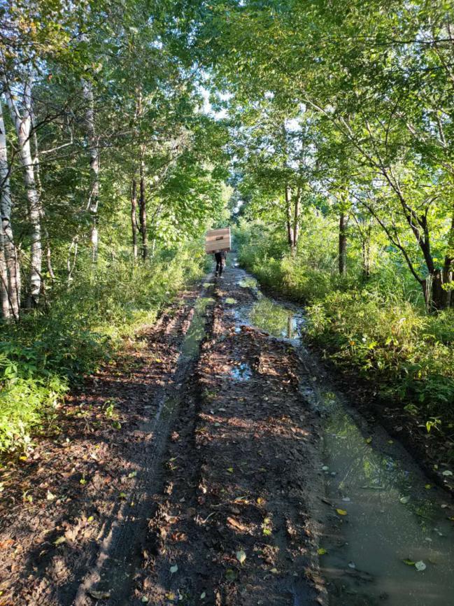 一路開下來,車身濺起不少泥垢。快到目的地時(shí),一段泥濘的林間小路攔住了王能的去路。原來,道路積水過多,泥土過軟,車輛不能前行。王能隨即將車??吭诼愤?,直接卷上褲腿,扛起電視前行。兩公里的林間路,本就不輕松,扛著電視更是“難上加難”。
