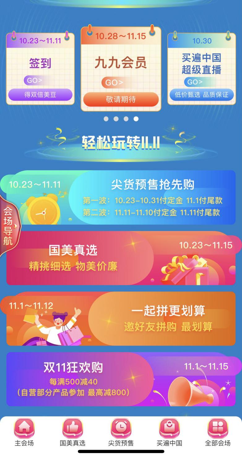 10月28日至11月25日,國美九九會員上線,只需九塊九,羊毛就能薅到手;10月30日,“買遍中國”直播杭州站開播,西湖美食便宜還好吃;11月1日-11月3日大促高峰啟動,各種紅包雨抽獎嗨不停;11月4日至11月6日,萬人直播,空前視覺盛宴奉上;11月7日至11月10日,買遍歐洲直播活動,全球好物任你挑;后續(xù)還有返場福利等你來拿!