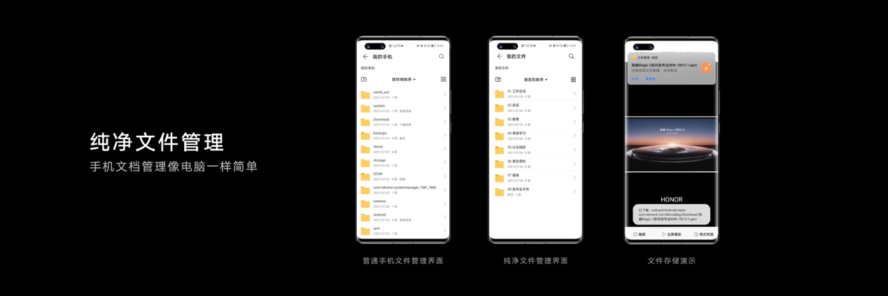 為了幫助事務(wù)繁多的商務(wù)人士更高效管理個人事務(wù),榮耀還與各辦公平臺合作,讓用戶在釘釘、飛書、Welink、WPS辦公平臺的日程均能通過榮耀Magic3系列進行統(tǒng)一管理。而新增的純凈文件管理系統(tǒng)(此功能后續(xù)通過 OTA升級支持),則使榮耀Magic3系列在文件保存和管理方面進行進一步簡化,讓手機文件管理從此可以像電腦一樣簡單便捷。