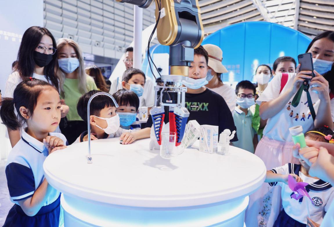 這牛奶和其他的不太一樣,很香濃。“離心精萃‘白科技’開(kāi)啟臻濃新紀(jì)元”展臺(tái)一直就是博覽會(huì)現(xiàn)場(chǎng)的“人氣王”,這里以宇宙探索為主題,科幻感十足,火箭發(fā)動(dòng)機(jī)噴出淡淡煙霧,三臺(tái)智能機(jī)械臂不停忙碌,人們排起長(zhǎng)隊(duì),品嘗由“離心精萃科技”現(xiàn)場(chǎng)調(diào)制的伊利臻濃牛奶。在這里,吸引觀眾的不僅是美味的伊利牛奶,也有滿滿的數(shù)字科技。