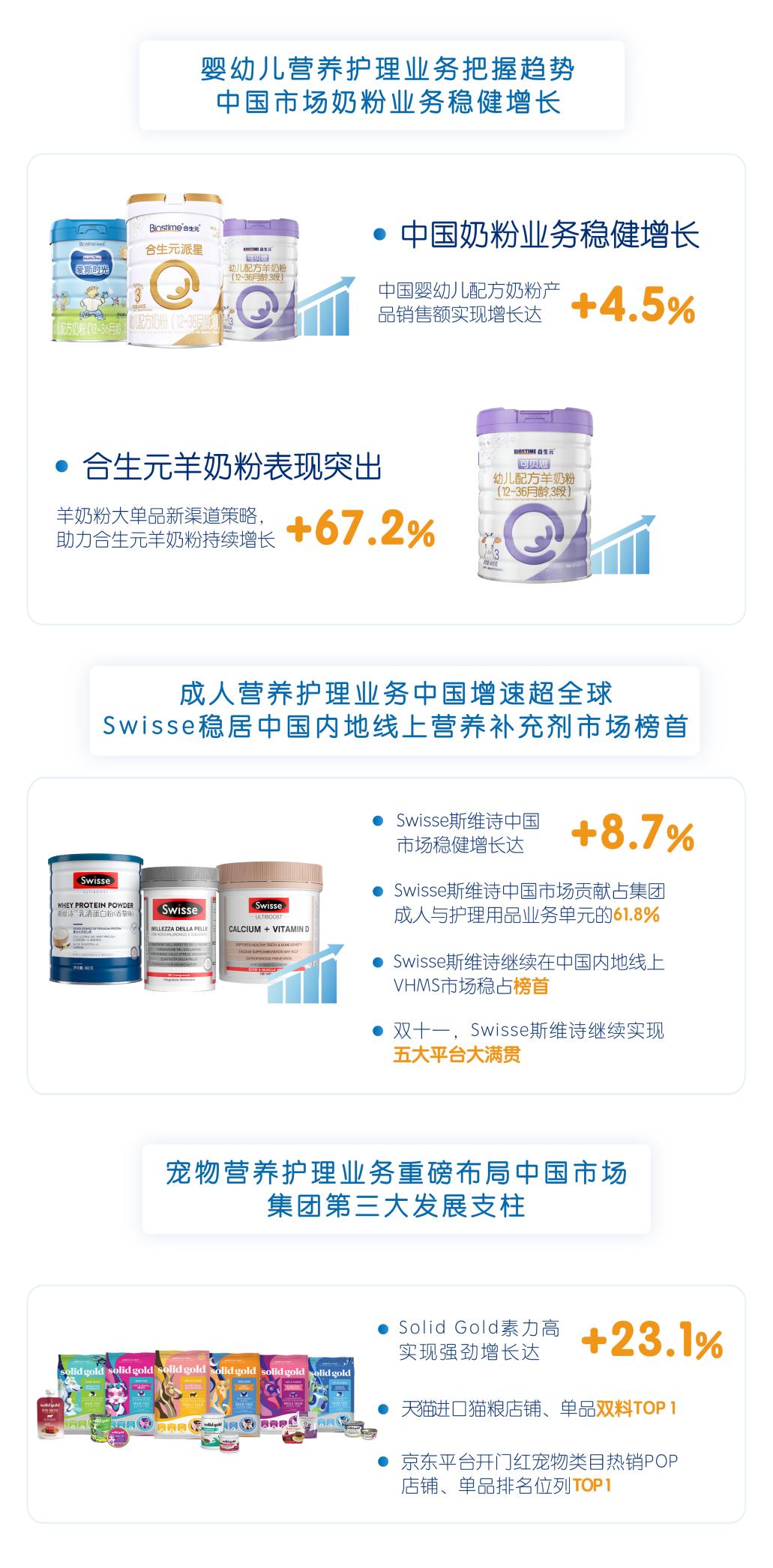 其中,嬰幼兒營養(yǎng)及護(hù)理用品業(yè)務(wù)單元(BNC)中的中國市場奶粉業(yè)務(wù)銷售額實現(xiàn)4.5%增長;成人營養(yǎng)及護(hù)理用品業(yè)務(wù)單元(ANC)銷售額全球升勢明顯,達(dá)5.8%,其中ANC中國市場增幅達(dá)8.7%;寵物營養(yǎng)及護(hù)理用品業(yè)務(wù)單元(PNC)營收達(dá)3.45億元,Solid Gold素力高同比增長達(dá)23.1%, PNC中國市場在PNC業(yè)務(wù)單元占比41.1%。