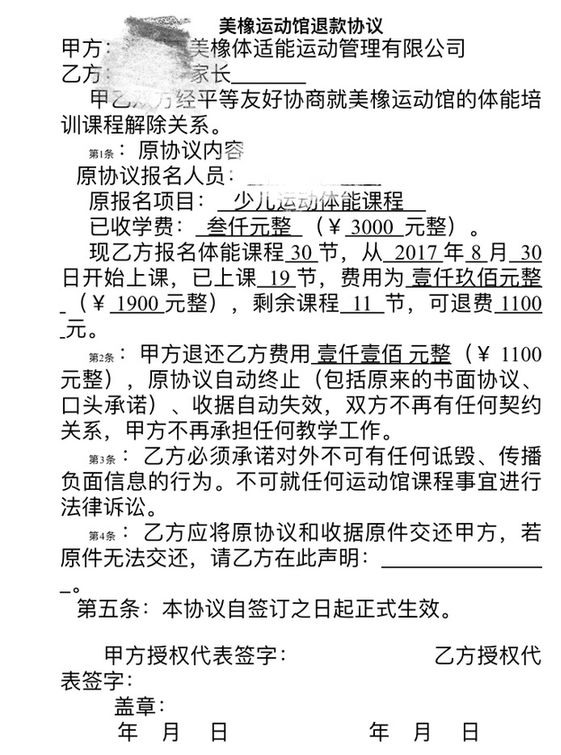 我于2017年8月30日續(xù)報(bào)深圳市美橡體適能運(yùn)動(dòng)管理有限公司體能課程,已經(jīng)是第三次報(bào)了,每次3000元,30節(jié)課,都是與教練微信溝通與轉(zhuǎn)帳。2018年1月10日收到該公司通知說(shuō)結(jié)束體能館的業(yè)務(wù),不再營(yíng)業(yè),說(shuō)統(tǒng)一給我們退剩余的課程費(fèi)用,12號(hào)加了該公司財(cái)務(wù)微信溝通相關(guān)退費(fèi)事宜,財(cái)務(wù)說(shuō)統(tǒng)計(jì)好在一周內(nèi)統(tǒng)一給我們退費(fèi),19號(hào)收到財(cái)務(wù)信息,說(shuō)可以退回1100元,還說(shuō)幾天后可以退款,并說(shuō)好通過(guò)微信退還(當(dāng)時(shí)壓根沒(méi)有說(shuō)簽協(xié)議后再退),一周拖一周,在23號(hào)忽然發(fā)微信來(lái)通知說(shuō)要求去簽協(xié)議才退款,當(dāng)天又進(jìn)行了協(xié)商,因?yàn)槲規(guī)z小孩實(shí)在抽不出時(shí)間去他們公司,能否把協(xié)議發(fā)到我郵箱確認(rèn),財(cái)務(wù)說(shuō)先與他老板匯報(bào)后第二天給回復(fù),但第二天也沒(méi)有收到任何回復(fù),然后又問(wèn)財(cái)務(wù)協(xié)議發(fā)過(guò)來(lái)了嗎?財(cái)務(wù)二話(huà)沒(méi)說(shuō)就把協(xié)議通過(guò)微信發(fā)給我,當(dāng)時(shí)想想簽了就算了,但細(xì)看第三、四條真的很難讓人接受,內(nèi)容詳見(jiàn)附件1。我們交費(fèi)的時(shí)候什么協(xié)議、收據(jù)對(duì)方都沒(méi)給,現(xiàn)在退錢(qián)就要求我們簽協(xié)議,而且是霸王條款,還叫我寫(xiě)上“我自愿終止培訓(xùn)課程”,老天哪是我自愿的,真是有種迫良為猖的感覺(jué),還有第三條,也太污辱人格了,再次和他們友好協(xié)商希望把協(xié)議第三條改了,對(duì)方視而不見(jiàn),不理不睬,也不積極回應(yīng)。