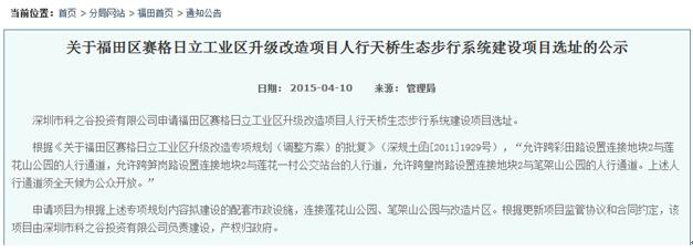 而據(jù)資料記載,市規(guī)土委曾經(jīng)在2015年4月10日,在福田管理局官網(wǎng)上發(fā)布了《關(guān)于福田區(qū)賽格日立工業(yè)區(qū)升級改造項目人行天橋生態(tài)步行系統(tǒng)建設(shè)項目選址的公示》,其中明確提到“根據(jù)《關(guān)于福田區(qū)賽格日立工業(yè)區(qū)升級改造專項規(guī)劃(調(diào)整方案)的批復(fù)》(深規(guī)土函[2011]1929號),‘允許跨彩田路設(shè)置連接地塊2與蓮花山公園的人行通道,允許跨筍崗路設(shè)置連接地塊2與蓮花一村公交站臺的人行道,允許跨皇崗路設(shè)置連接地塊2與筆架山公園的人行通道。上述人行通道須全天候為公眾開放’。”