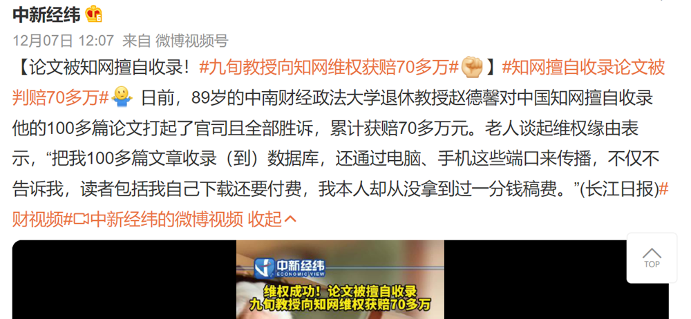 10.【法治事件】89歲退休法學(xué)教授趙德馨,從中國知網(wǎng)那里討回了自己160多篇稿件70多萬元元的收入,成為目前已知第一個向中國知網(wǎng)維權(quán)成功的勝訴案例。