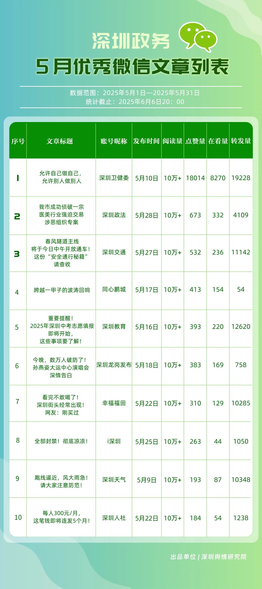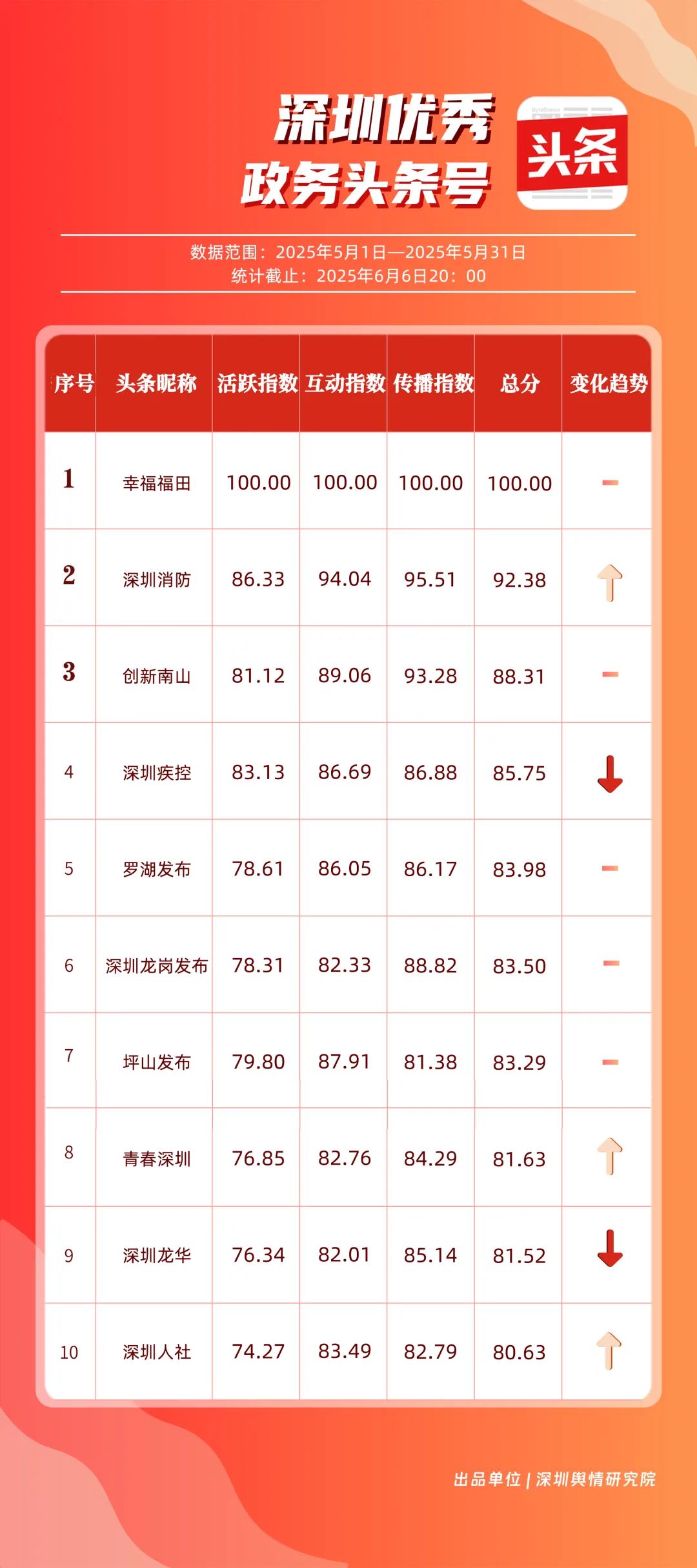 5月,“幸福福田”“深圳消防”“創(chuàng)新南山”“深圳疾控”“羅湖發(fā)布”“深圳龍崗發(fā)布”“坪山發(fā)布”“青春深圳”“深圳龍華”“深圳人社”共10個政務(wù)頭條號入選“優(yōu)秀政務(wù)頭條號”榜單。在榜單前三名中,“幸福福田”“創(chuàng)新南山”以穩(wěn)定且高質(zhì)量的內(nèi)容輸出,持續(xù)領(lǐng)跑,排名較上個月未發(fā)生變動。位居榜單第二的“深圳消防”同樣表現(xiàn)亮眼,排名較上個月提升2個名次,充分展現(xiàn)了其在消防安全宣傳領(lǐng)域的持續(xù)深耕和創(chuàng)新突破。上榜政務(wù)頭條號各展所長,以優(yōu)質(zhì)內(nèi)容為核心,充分發(fā)揮平臺傳播優(yōu)勢,為政務(wù)信息的高效觸達與廣泛傳播樹立了標(biāo)桿。