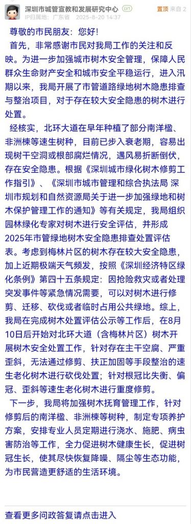 經(jīng)核實,北環(huán)大道在早年種植了部分南洋楹、非洲楝等速生樹種,目前已步入衰老期,容易出現(xiàn)樹干空洞或根部腐爛情況,遇風易折斷倒伏,存在安全隱患。根據(jù)《深圳城市綠化樹木修剪工作指引》、《深圳市城市管理和綜合執(zhí)法局 深圳市規(guī)劃和自然資源局關于進一步加強綠地和樹木保護管理工作的通知》等有關規(guī)定,我局組織園林綠化專家對樹木進行安全評估,并形成2025年市管綠地樹木安全隱患排查處置評估表??紤]到梅林片區(qū)的樹木存在較大安全隱患,加上近期極端天氣頻發(fā),按照《深圳經(jīng)濟特區(qū)綠化條例》第四十五條規(guī)定:因搶險救災或者處理突發(fā)事件等緊急情況需要,可以對樹木進行修剪、遷移、砍伐或者臨時占用公共綠地。綜上,我局在完成樹木處置評估公示等工作后,在8月10日后開始對北環(huán)大道(含梅林片區(qū))樹木開展樹木安全處置工作,針對存在主干空腐、嚴重歪斜,無法通過修剪、扶正加固等手段整治的速生老化樹木進行砍伐處置;針對根冠比失衡、偏冠、歪斜等速生老化樹木進行重度修剪。
