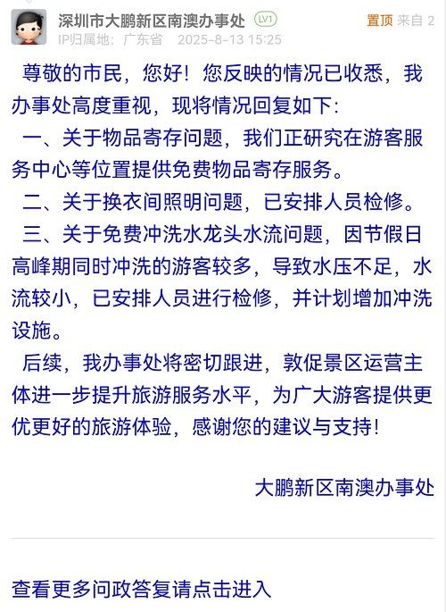 三、關于免費沖洗水龍頭水流問題,因節(jié)假日高峰期同時沖洗的游客較多,導致水壓不足,水流較小,已安排人員進行檢修,并計劃增加沖洗設施。