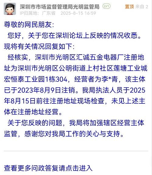 尊敬的網(wǎng)民朋友:您好,關于您在深圳論壇上反映的情況收悉?,F(xiàn)將有關情況回復如下:經(jīng)核實,深圳市光明區(qū)匯誠五金電器廠注冊地址為深圳市光明區(qū)公明街道上村社區(qū)蓮塘工業(yè)城宏恒泰工業(yè)園1棟304,經(jīng)營者為李*青,該主體已于2023年8月9日注銷。我局執(zhí)法人員于2025年8月15日前往注冊地址現(xiàn)場檢查,未見上述主體在注冊地址經(jīng)營。關于您反映的問題,我局將加強轄區(qū)經(jīng)營主體監(jiān)管,感謝您對我局工作的關心與支持。