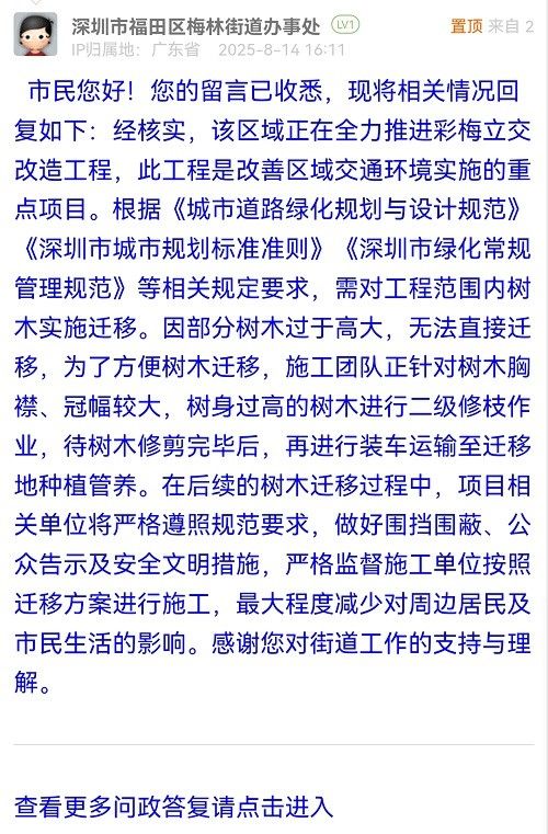 市民您好!您的留言已收悉,現(xiàn)將相關情況回復如下:經(jīng)核實,該區(qū)域正在全力推進彩梅立交改造工程,此工程是改善區(qū)域交通環(huán)境實施的重點項目。根據(jù)《城市道路綠化規(guī)劃與設計規(guī)范》《深圳市城市規(guī)劃標準準則》《深圳市綠化常規(guī)管理規(guī)范》等相關規(guī)定要求,需對工程范圍內樹木實施遷移。因部分樹木過于高大,無法直接遷移,為了方便樹木遷移,施工團隊正針對樹木胸襟、冠幅較大,樹身過高的樹木進行二級修枝作業(yè),待樹木修剪完畢后,再進行裝車運輸至遷移地種植管養(yǎng)。在后續(xù)的樹木遷移過程中,項目相關單位將嚴格遵照規(guī)范要求,做好圍擋圍蔽、公眾告示及安全文明措施,嚴格監(jiān)督施工單位按照遷移方案進行施工,最大程度減少對周邊居民及市民生活的影響。感謝您對街道工作的支持與理解。